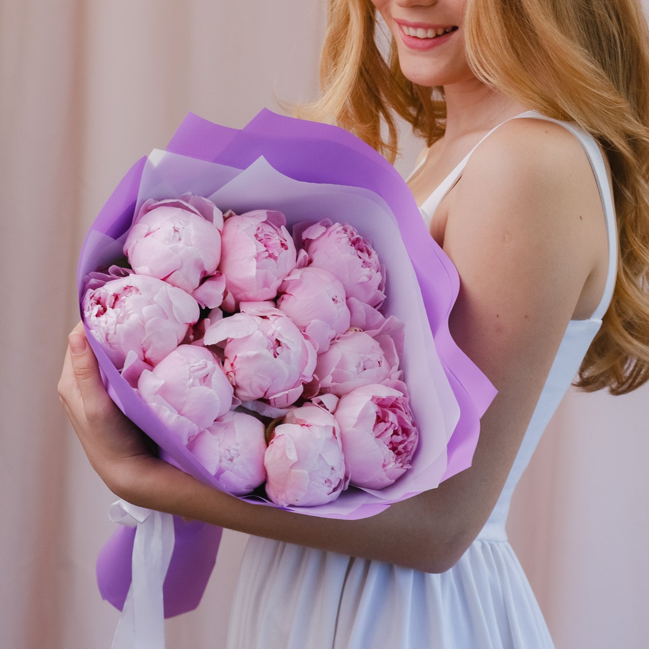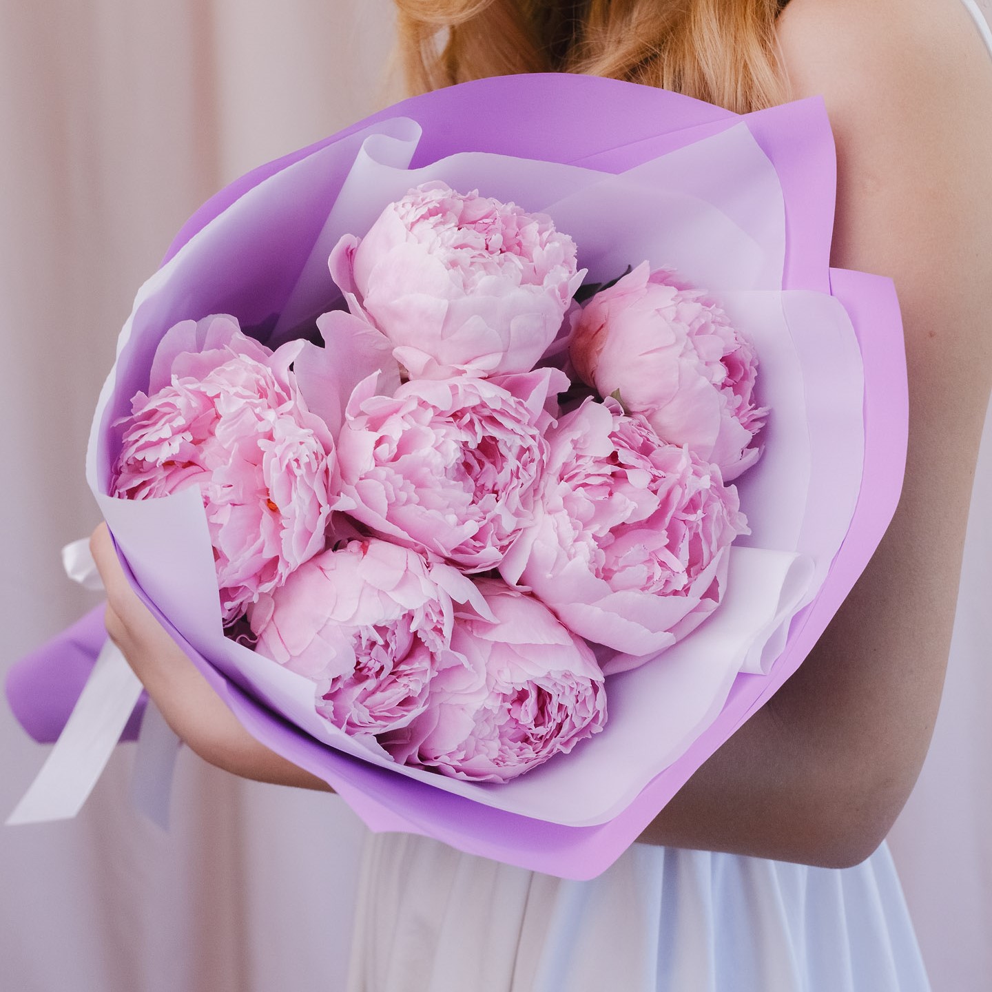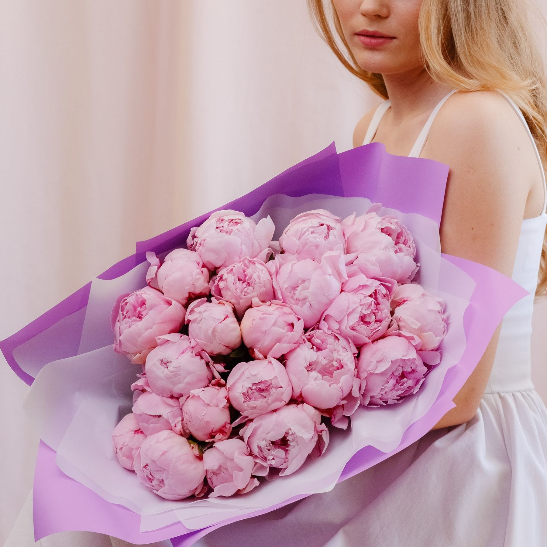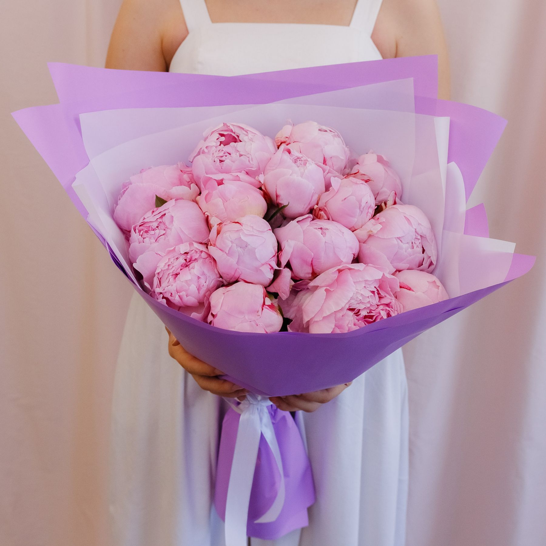 Монобукет из розовых пионов "Сара Бернард" в фиолетовой упаковке
