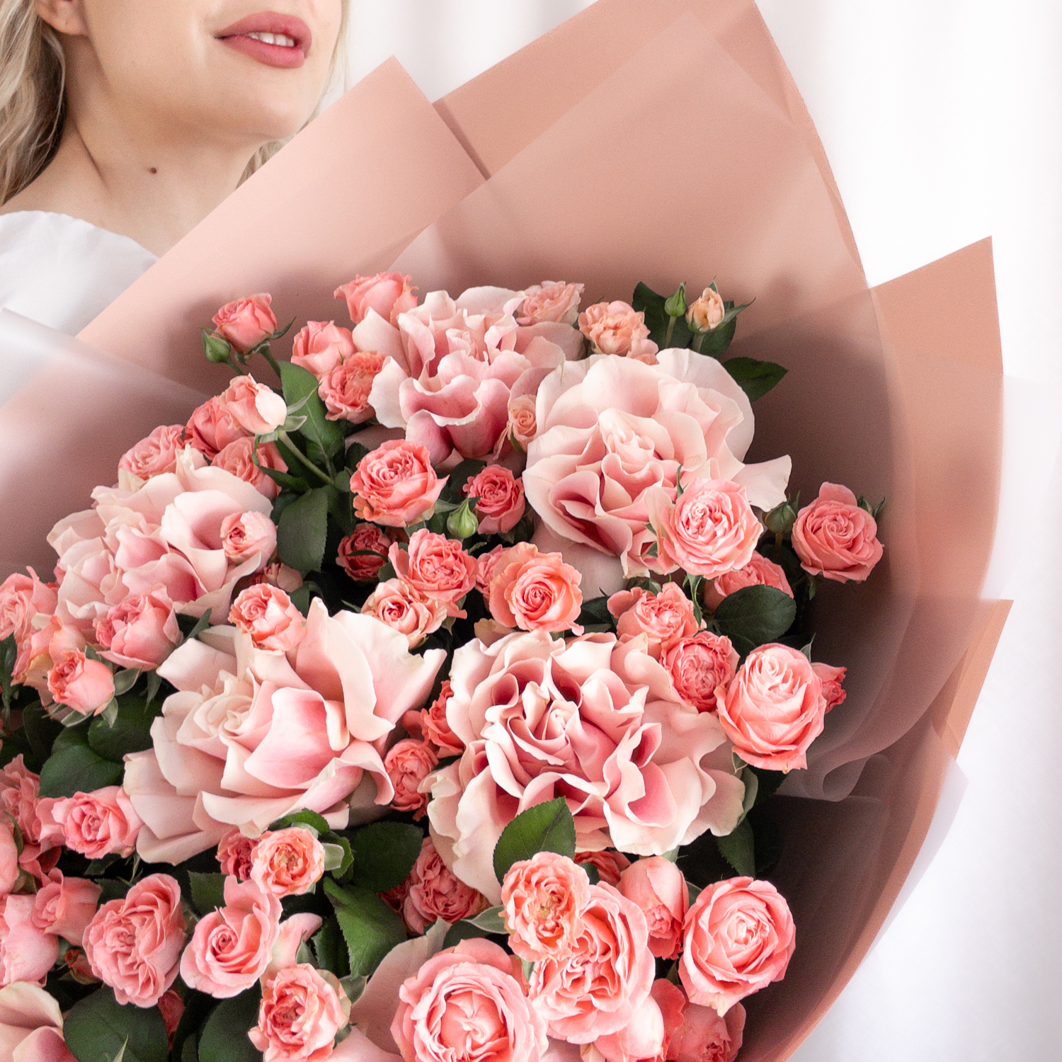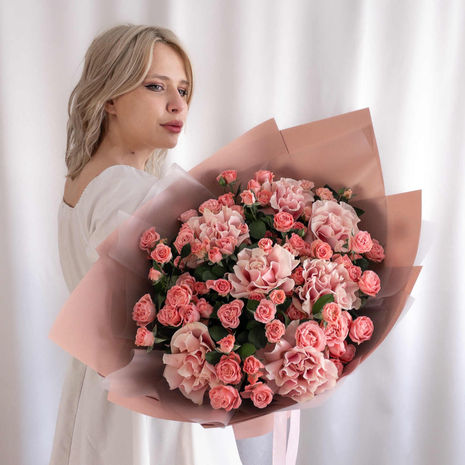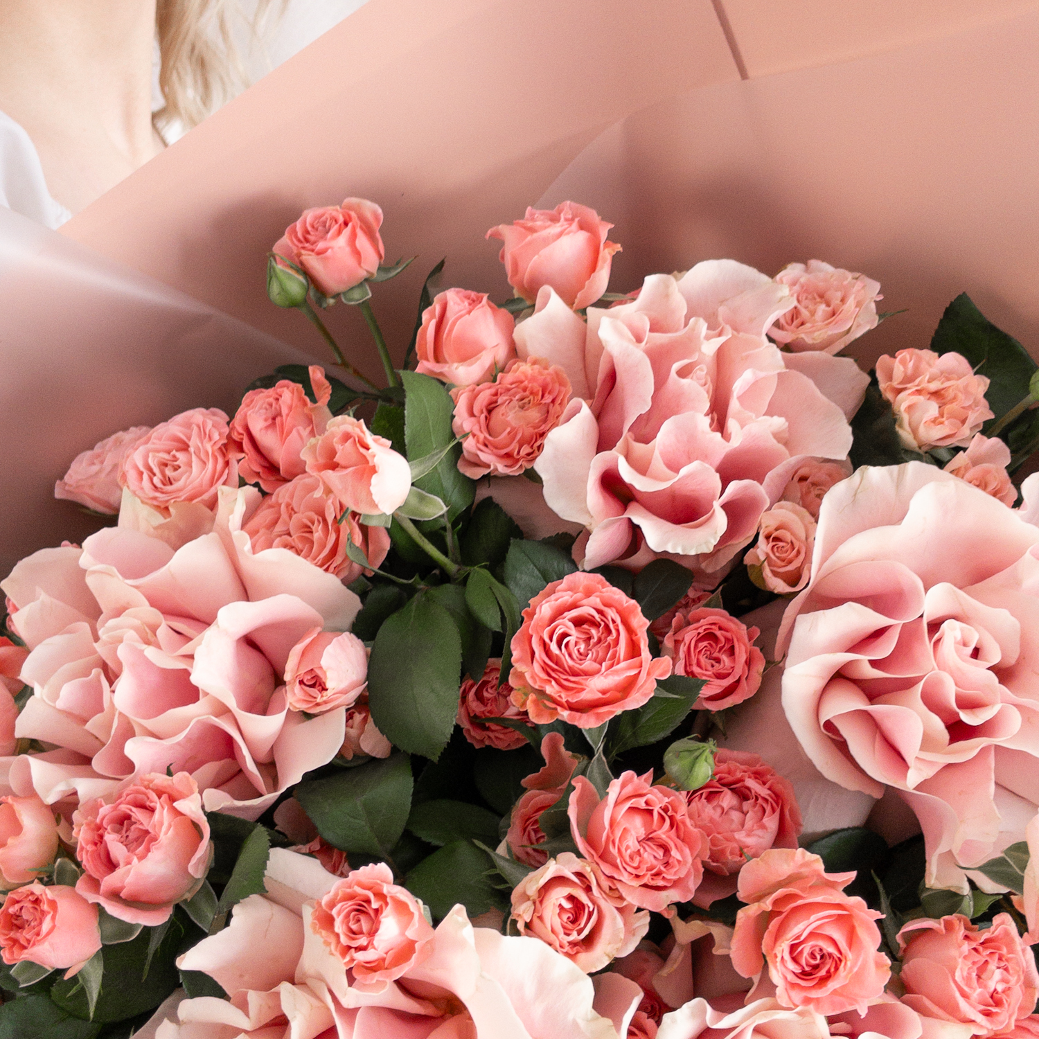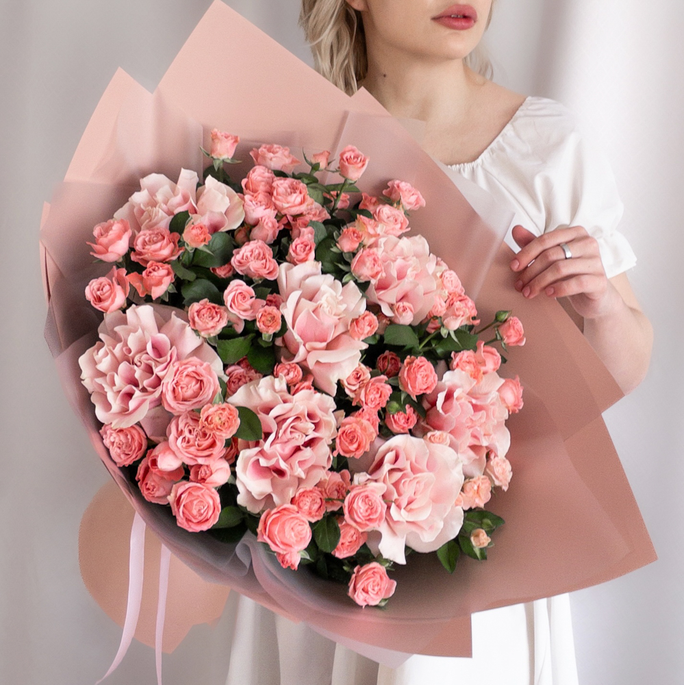 Букет из французских и кустовых роз в розовой гамме