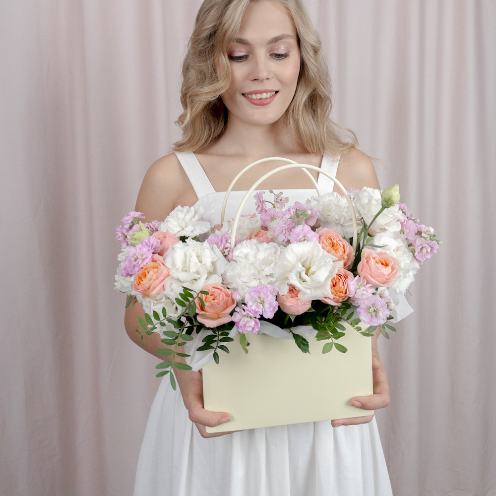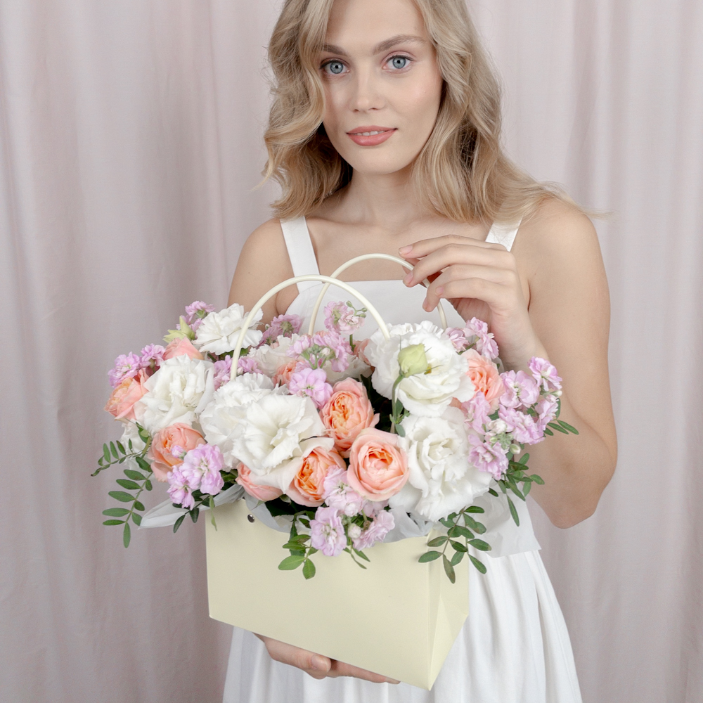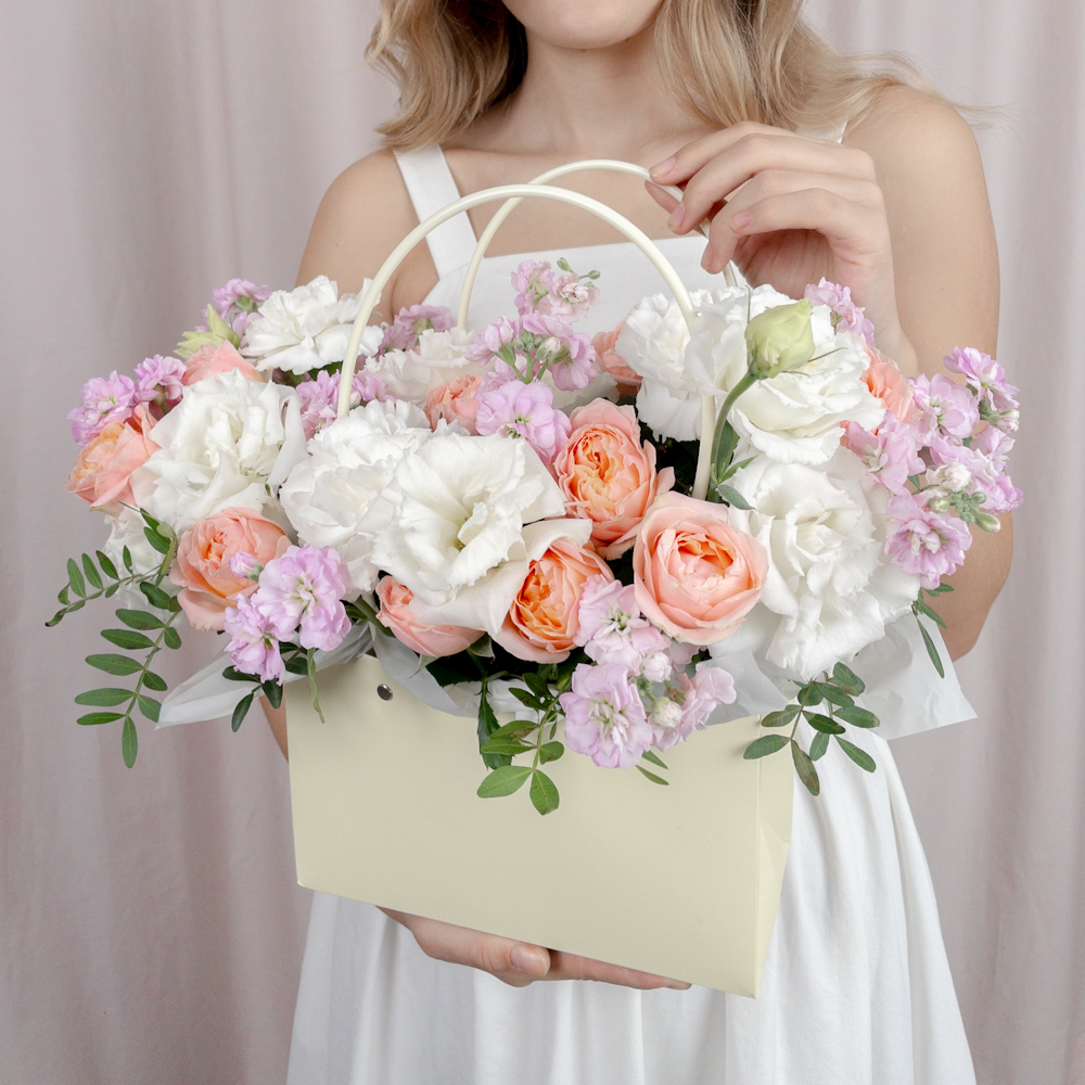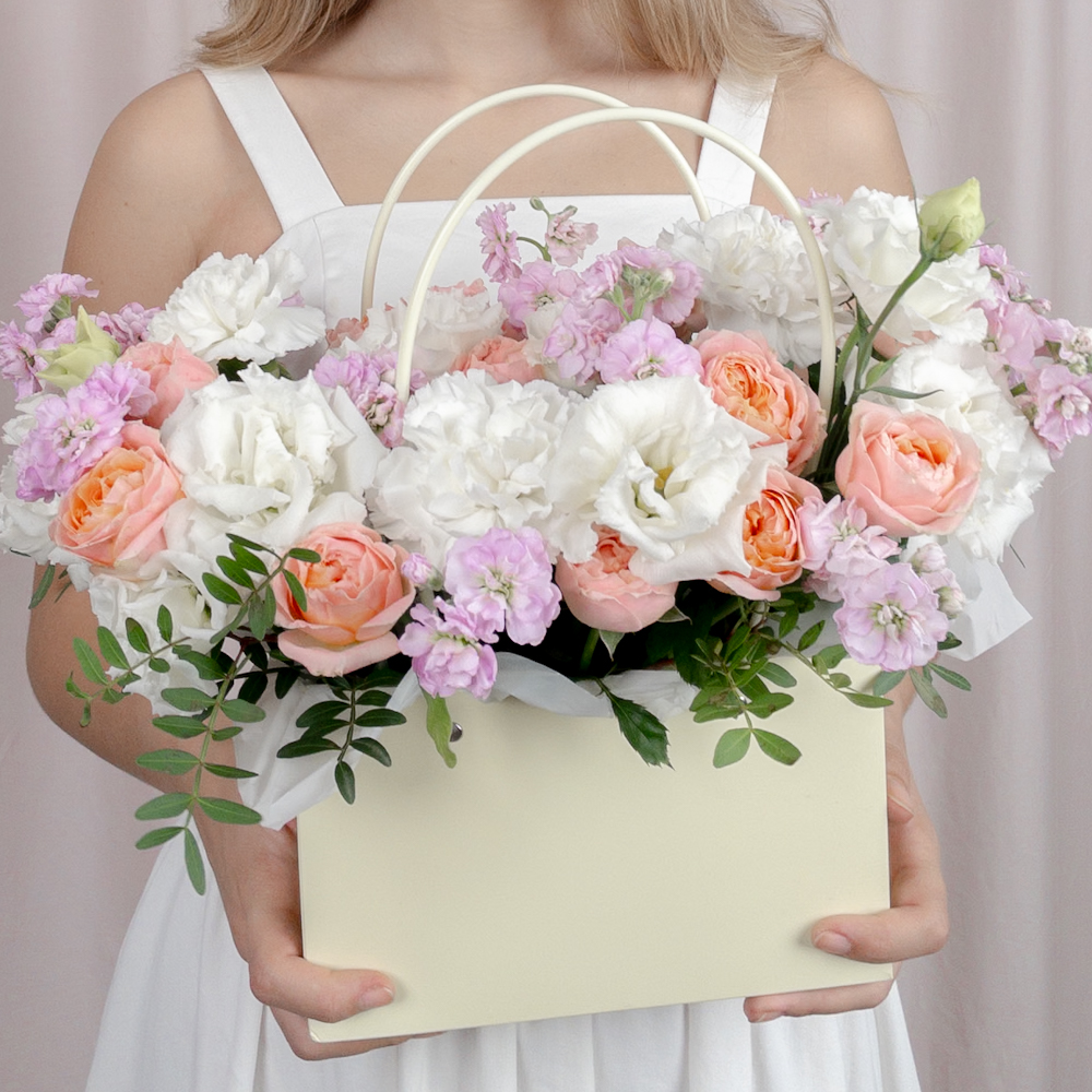 Композиция в сумочке с белоснежной маттиолой и кустовой розой