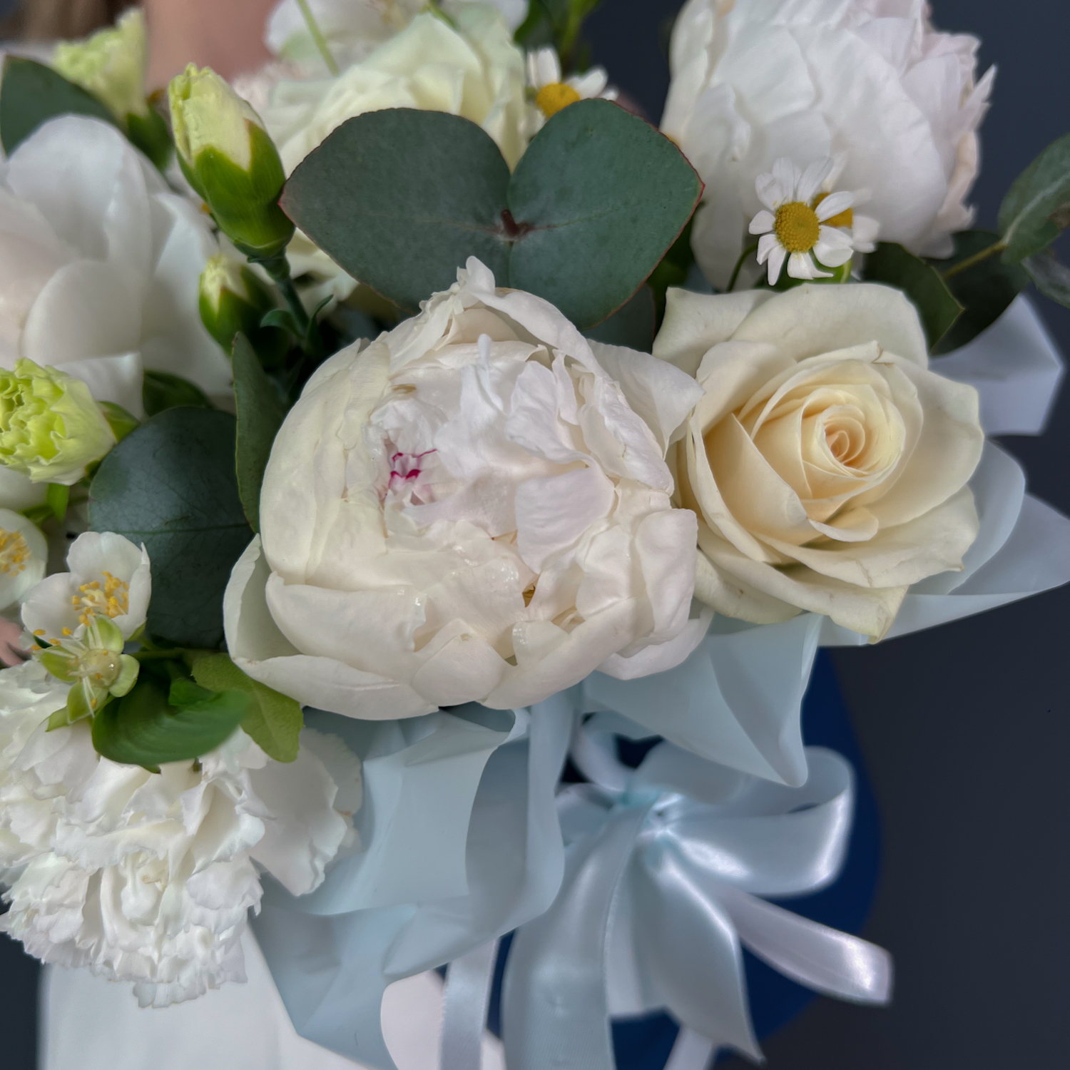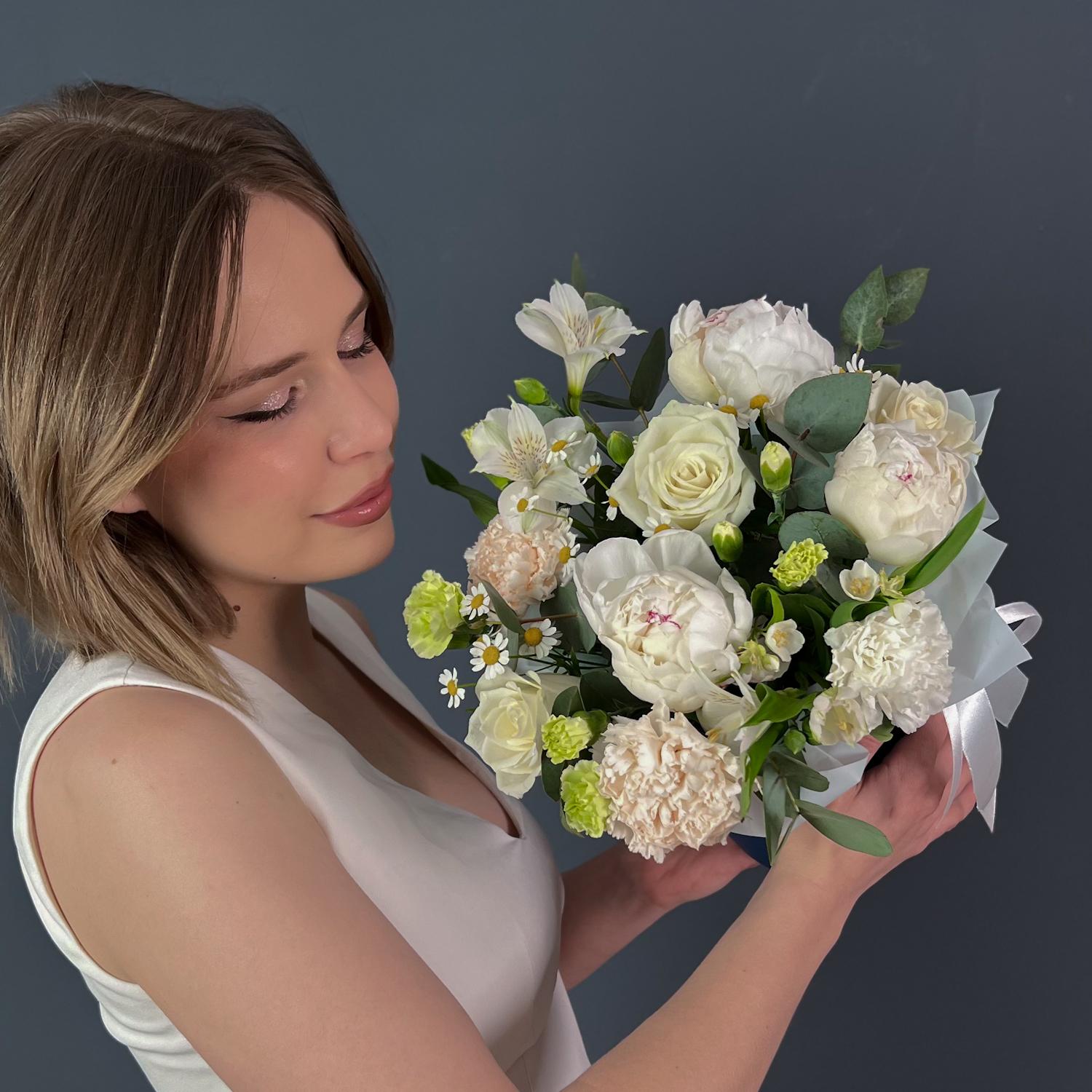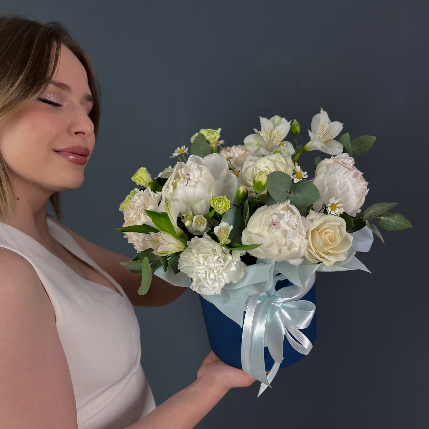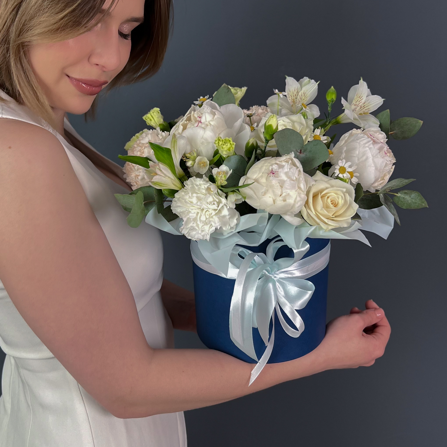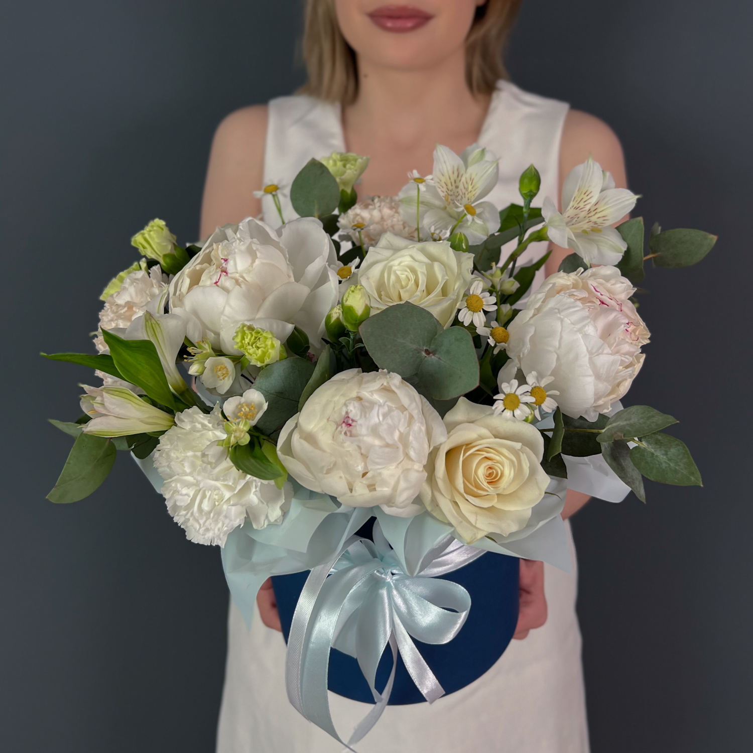 Коробка с белыми пионами
