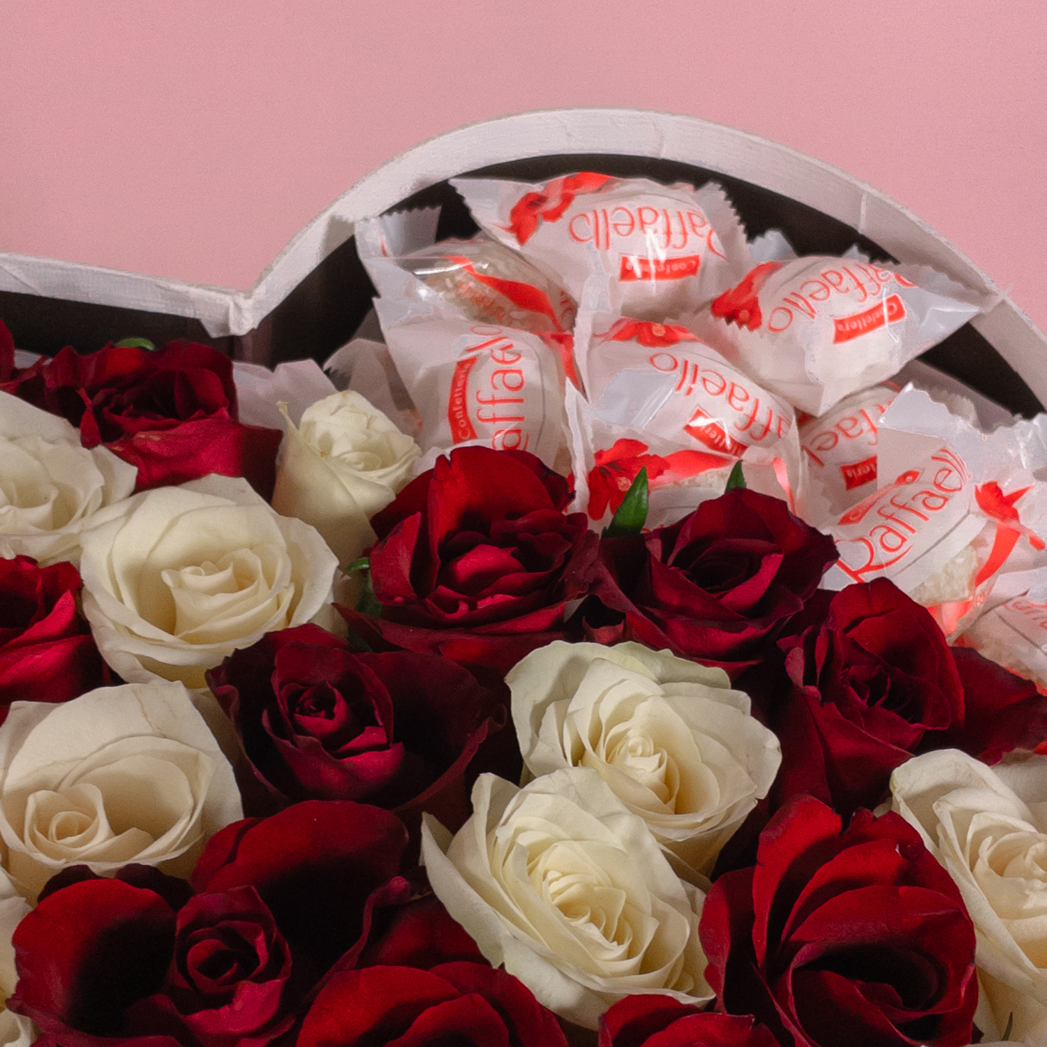 Сердце с красно-белыми розами и конфетами